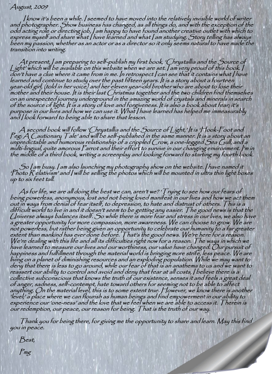December 22, 2007Christmas Message from PaulI suppose the thing I know best about this time of the year is my yearning and what I feel of the world’s yearning. For peace…for love…understanding…some gentleness…compassion and light. In the birthplace of the Judeo/Christian mythology, where this was originally the longest and darkest day and night of the year…when it seemed that the darkness would never leave and light would never return…our ancestors chose the plant that is always green, the ‘Ever’-green tree, and decorated it with gifts and entreaties to bring back the light. Our Christmas tree. In this time on our planet when our family of man is growing to over-crowding, when our resources for sustaining life on this great host, Mother Earth are now seen as finite and the only argument aggrivated by greed and fear is ‘how long’ before we have soiled our nest beyond repair and destroyed the world and future of our children’s children…it is imperative that we listen. Listen to ourselves. Listen to each other.