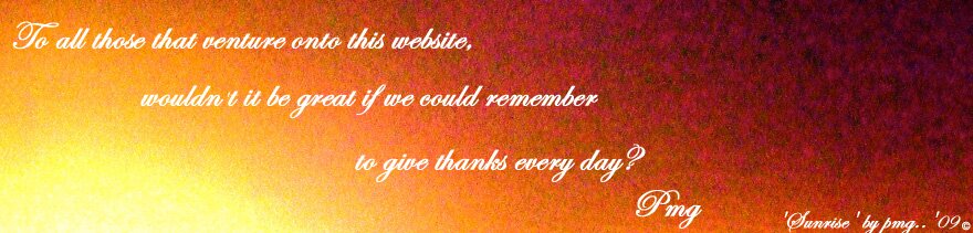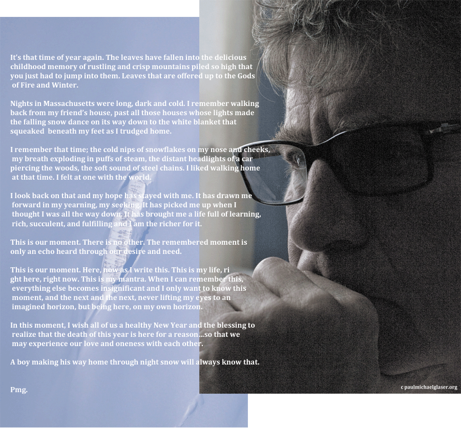 December 24, 2008I wonder at this time of year. I wonder at my endings and beginnings, hopes and fears, losses and lessons, dreams and memories, my yearning and need, my abilities and frailties, my hope and my heart. At this time particularly when our minds would mark this life’s tumult of feelings in the infinite, invisible spin of time as a ‘year’ of suns and moons, a year of being tossed about by the inexorable push and pull of our breathing universe. I wonder at the phenomenon of existence: that we are part of all that is, that it is and that we are…here. And I wonder at our capacity for love, that we can choose this as a heaven. Paul |
