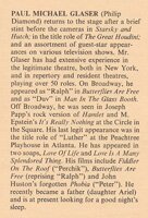 Then Mr. Pleasence takes off in flight. As the play, imperceptively at first, loses touch with life, so then does Mr. Pleasence. Now he is a monster, now the acting is melodramatic, but wonderfully melodramatic. A year ago Mr. Pleasence had difficulty with his accent---now this is perfect, and the change is typical of the honing process that the whole role has undergone. So that toward the end when the eyes glitter beadily in a tight-skinned skull, or, right at the conclusion, beaten like an old monkey yet still stubbornly defending his madness, Mr. Pleasence shows more than a touch of genius. But then so does Mr. Pinter. He has directed the play with just the right regard for shifts of emotion that Hitchcock shows in the movies. It reminded me of what a fine movie The Man in the Glass Booth might very well become..."one of the ten best stage performances I have ever seen."...Tom Prideaux of LIFE MAGAZINE